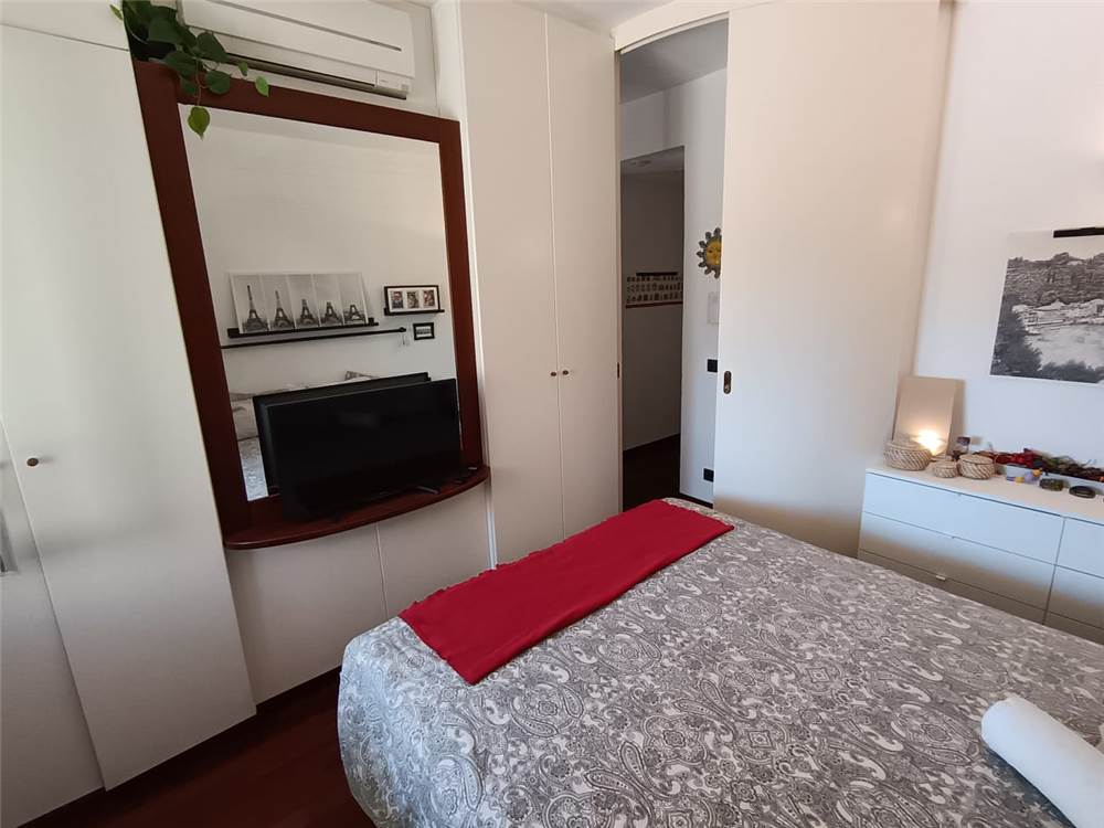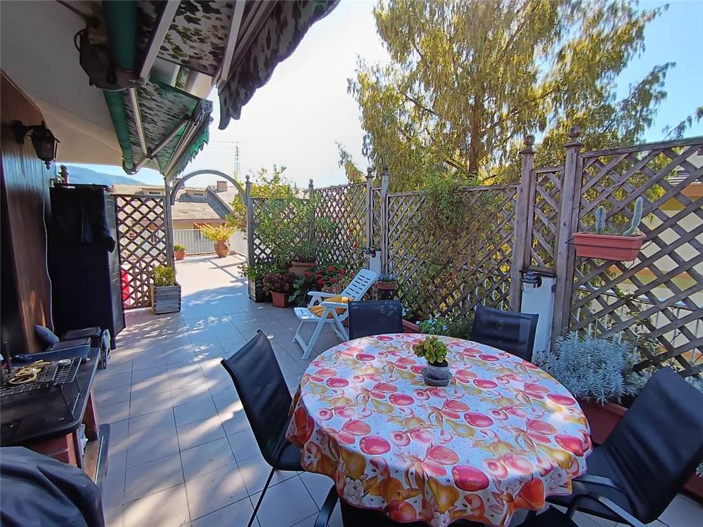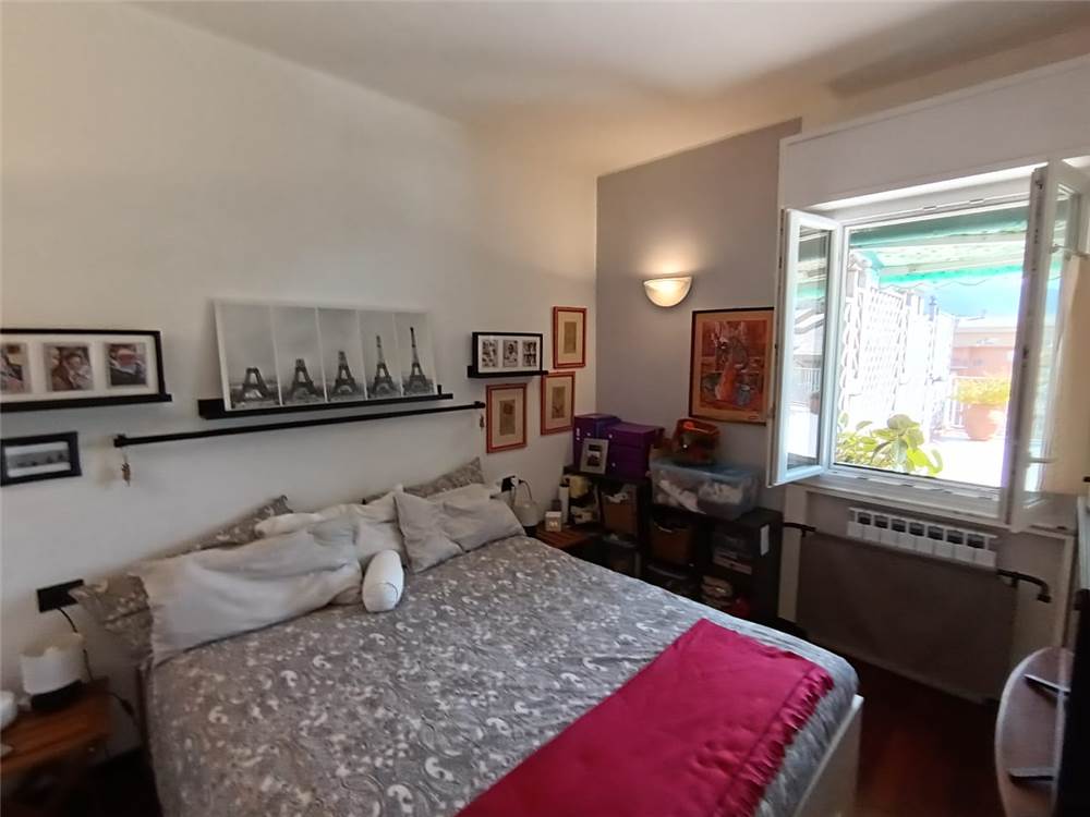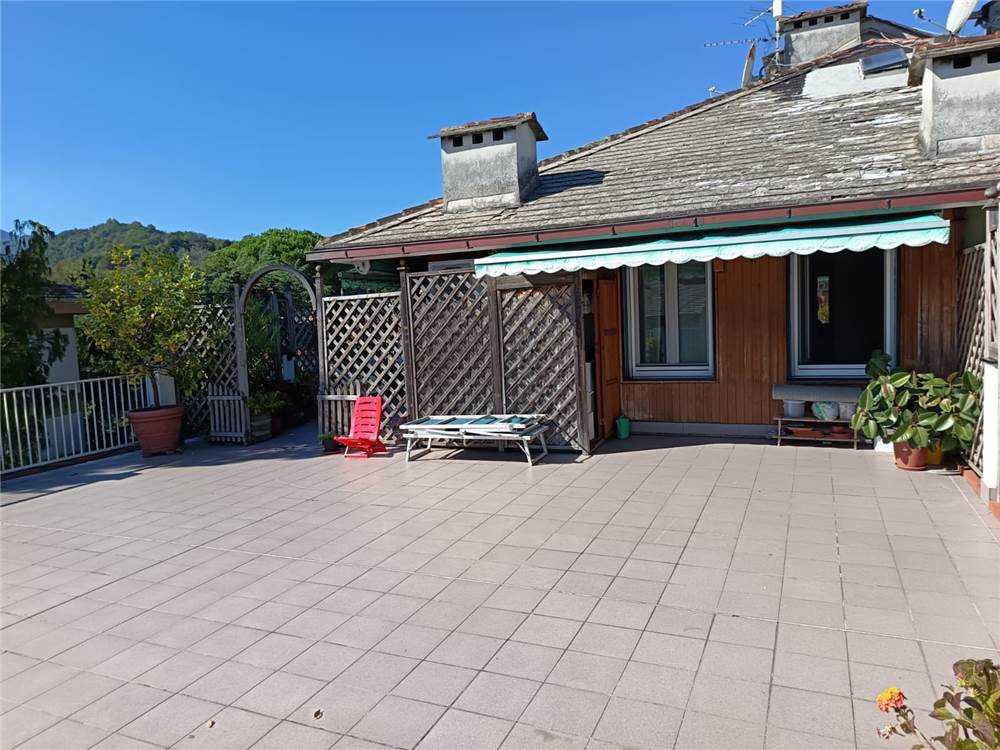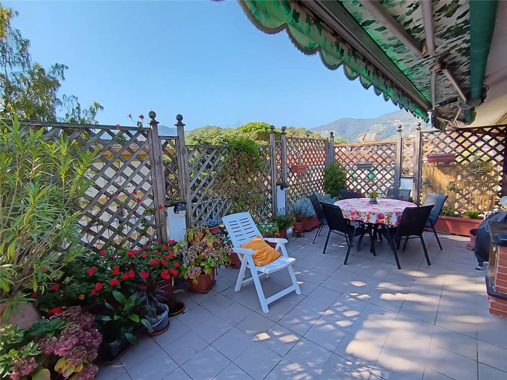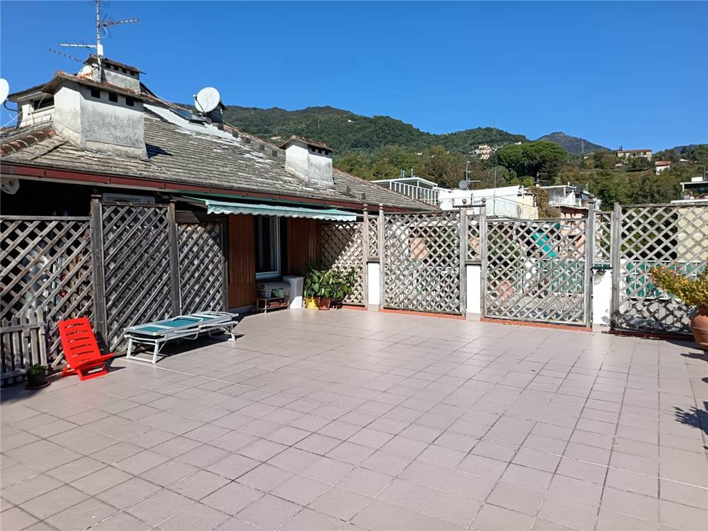 Rapallo - Vie della Pineta - Grazioso attico di circa 38 mq. con terrazzo di circa 95 mq. accessoriato e dotato di tende parasole. L'immobile è in ottime condizioni generali, ed è composto da: ingresso, angolo cottura con soggiorno. camera da letto e bagno. Appena istallati serramenti con vetri doppi in PVC, cassettoni e tapparelle. Il riscaldamento è autonomo con caldaia sostituita nel 2024. L'immobile è provvisto inoltre dell'impianto di aria condizionata con due split interni. Completa la proprietà una cantina provvista di scafali posta al piano terreno dello stabile. A livello condominiale sono stati già deliberati i lavori di rifacimento della coperture del tetto che rimangono a carico della parte venditrice. L'ottima esposizione est-sud-ovest dell'appartamento permette di godere di un costante soleggiamento per tutto l'arco della giornata. La zona è assolutamente silenziosa ed è provvista di posti auto e moto condominiali.