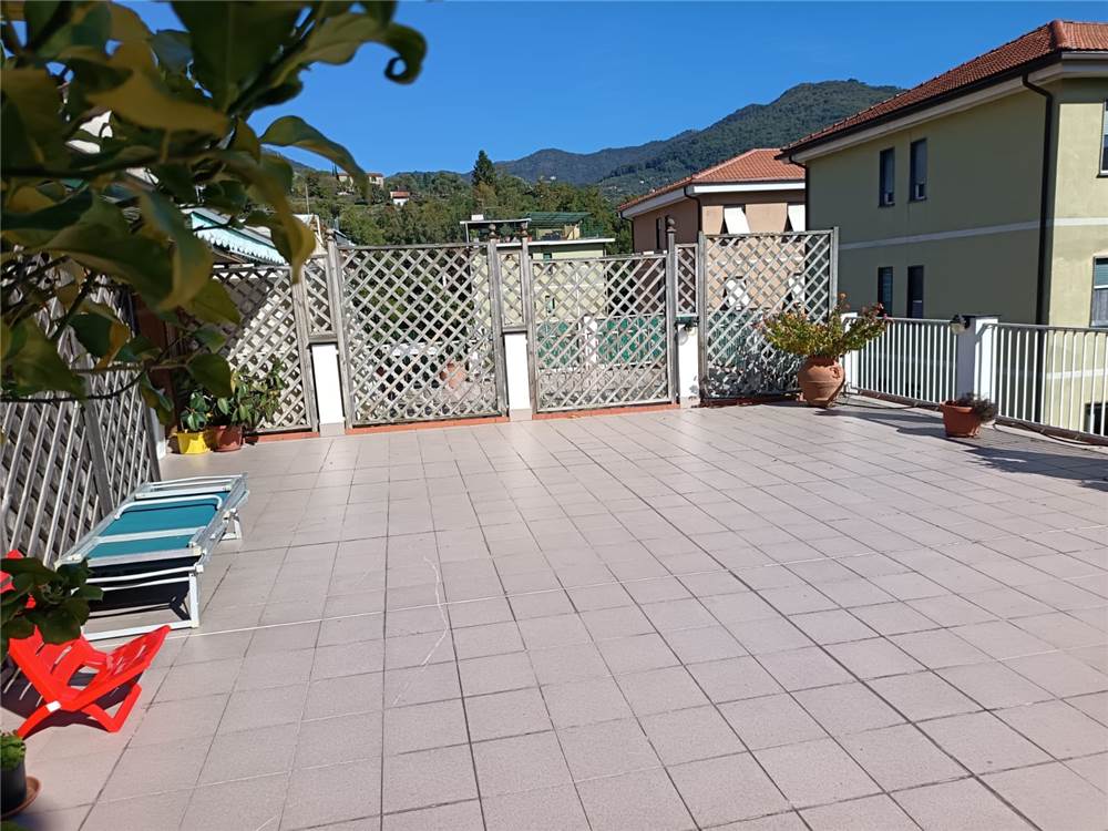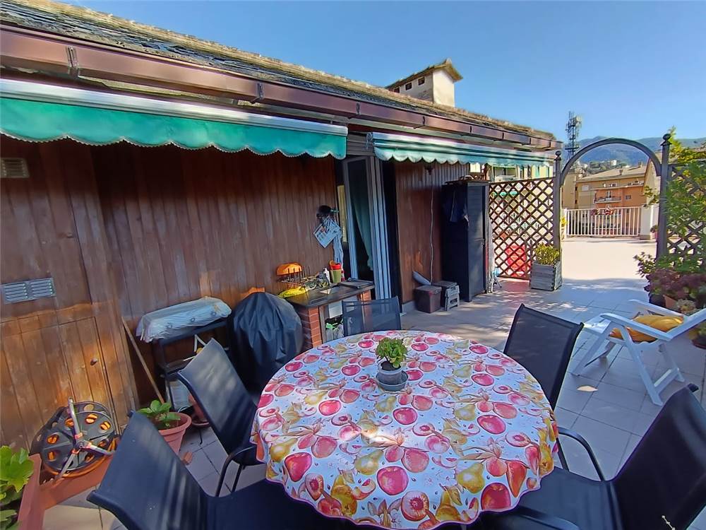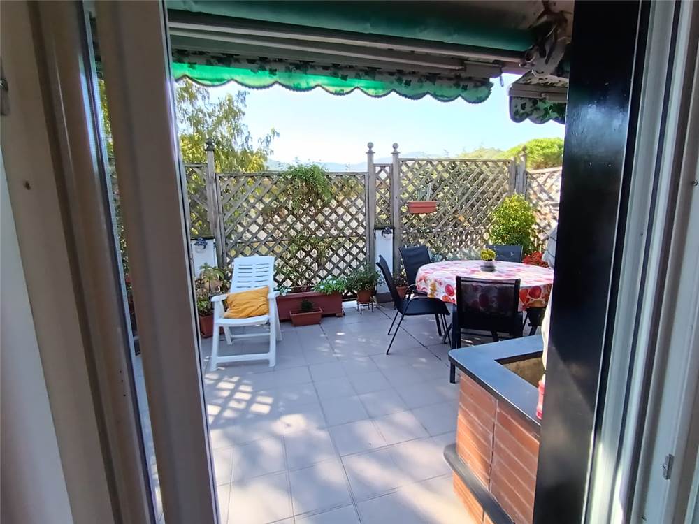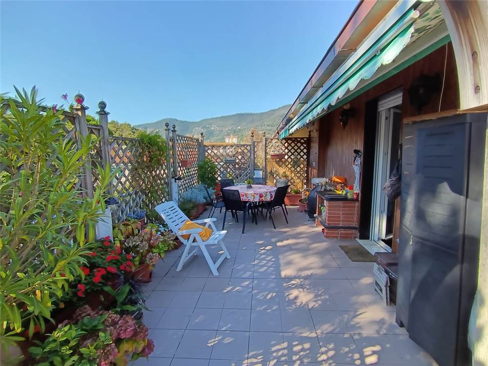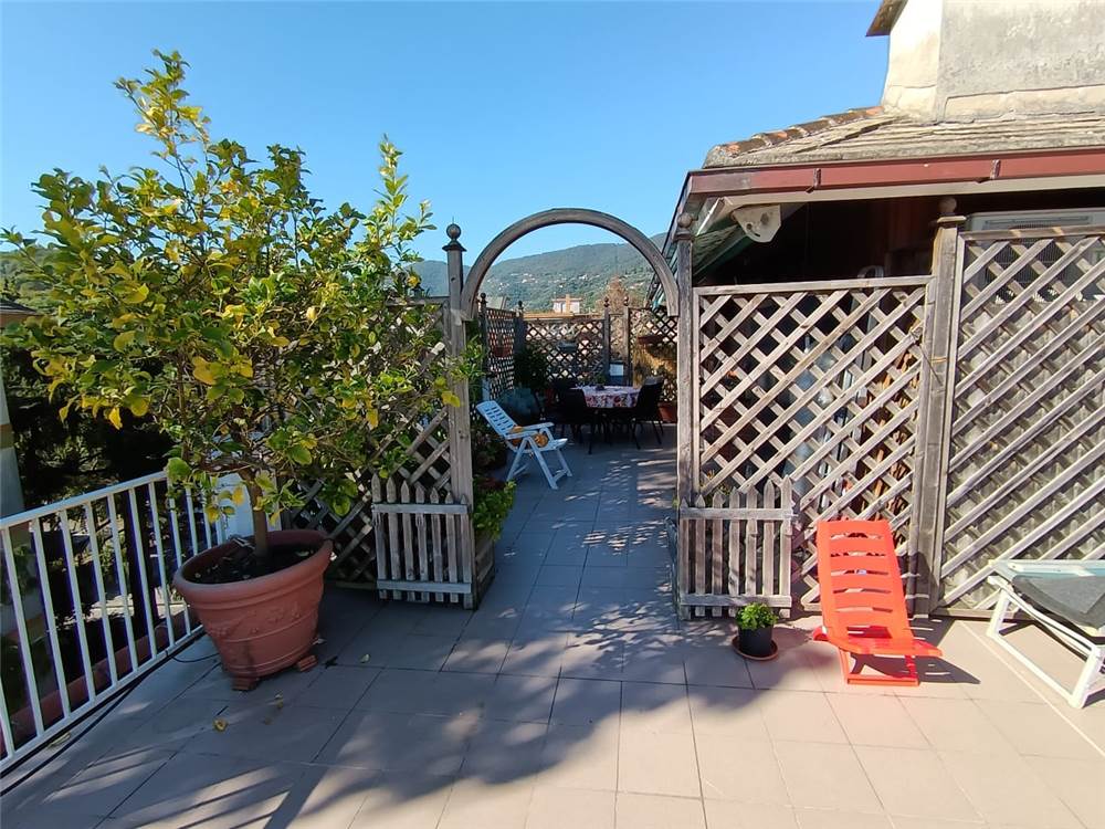 Rapallo - Vie della Pineta - Grazioso attico di circa 38 mq. con terrazzo di circa 95 mq. accessoriato e dotato di tende parasole. L'immobile è in ottime condizioni generali, ed è composto da: ingresso, angolo cottura con soggiorno. camera da letto e bagno. Appena istallati serramenti con vetri doppi in PVC, cassettoni e tapparelle. Il riscaldamento è autonomo con caldaia sostituita nel 2024. L'immobile è provvisto inoltre dell'impianto di aria condizionata con due split interni. Completa la proprietà una cantina provvista di scafali posta al piano terreno dello stabile. A livello condominiale sono stati già deliberati i lavori di rifacimento della coperture del tetto che rimangono a carico della parte venditrice. L'ottima esposizione est-sud-ovest dell'appartamento permette di godere di un costante soleggiamento per tutto l'arco della giornata. La zona è assolutamente silenziosa ed è provvista di posti auto e moto condominiali.